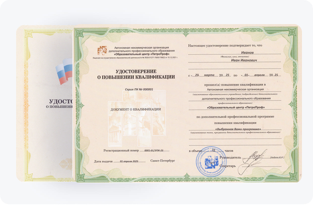 После успешного завершения программы каждый выпускник получает удостоверение о повышении квалификации (УПК), подтверждающее уровень компетенций в области проф.деятельности. Наш учебный центр имеет государственную лицензию на ведение образовательной деятельности, мы гарантируем высокое качество образовательных услуг и признание полученного документа работодателями всех уровней.